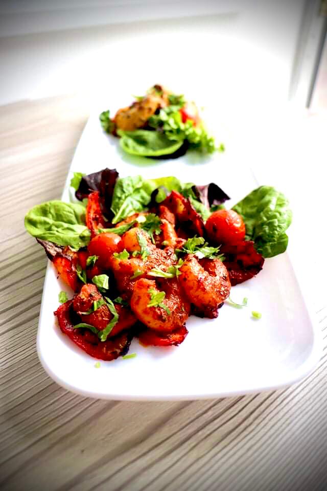 Marinated and spiced King Prawns, drizzled with lemon juice and served on a bed of tandoori onions and peppers. Beautiful and tasty seafood from Naheda’s Kitchen.